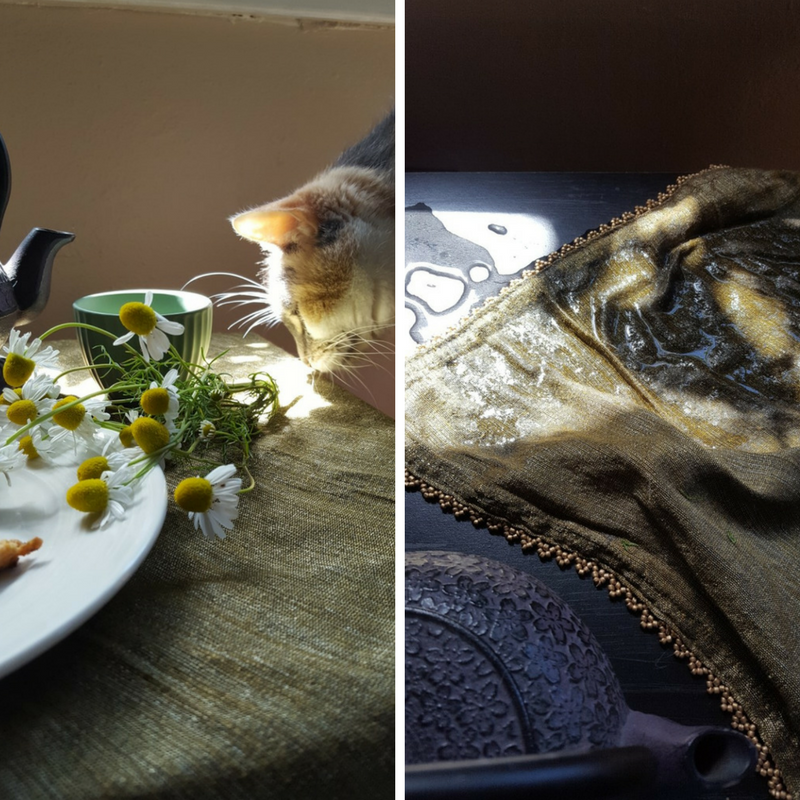 First photo there is a shot of me trying to set up the scene to photo these scones. Initially, I only had one cat helping (not unusual). But then, our ancient calico, Carmen, decided she needed to supervise. Supervision meant sitting observing from the cat tree. And then it involved sniffing the chamomile. Which then led to attacking the chamomile, getting a claw hung up in the napkin, and knocking over the tea cup and drenching everything. Really - not helpful. I mopped it all up and started over. Fortunately, the chamomile tea scones were all unharmed. The cat was totally unashamed. She sashayed over to the couch and finished supervising.