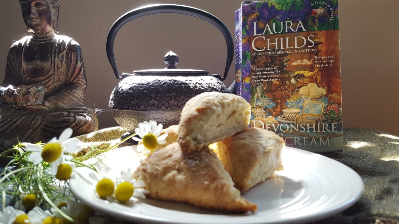 For the 30th edition of Novel Food, I opted to make chamomile tea scones. I wasn’t sure I was going to make a recipe by the deadline for this edition of Novel Food. The move, the new job, and so on, have cut into both reading and blogging time. Fortunately, I had a bit of a break this weekend and had the bonus day off on the 4th of July, so have been catching up on a lot of things, including reading and cooking. One of my favorite “cute” mystery series is Laura Childs’s tea shop series, featuring intrepid heroine Theodosia Browning. I adore Theodosia, with her blue eyes and her unruly auburn hair. She has a great dog (Earl Grey) and runs a perfect little tea shop in Charleston, SC. And of course, she keeps running into dead bodies and has to lend a hand to the local law enforcement to figure out whodunnit.
