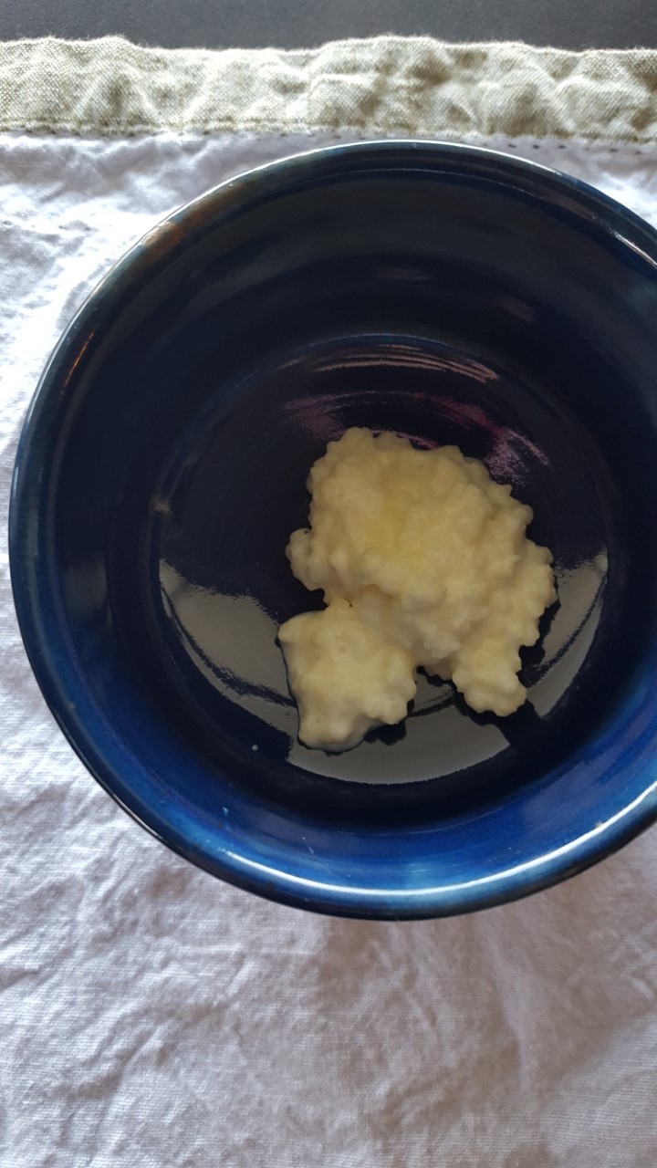 First off, kefir is the drink that’s made from kefir grains. Kefir grains are made up of yeasts and bacteria and look like, well, grains. I purchased my kefir grains from Etsy. It’s simple enough to search for kefir and find many, many different sources. I received a little under a tablespoon of grains, which have multiplied over the last few months. I’ve experimented with culturing both milk and cream. Fermented cream makes an exceptional substitute for sour cream. I’ve also learned through trial and error, that culturing kefir for a few days and then straining it makes a great cream cheese substitute.