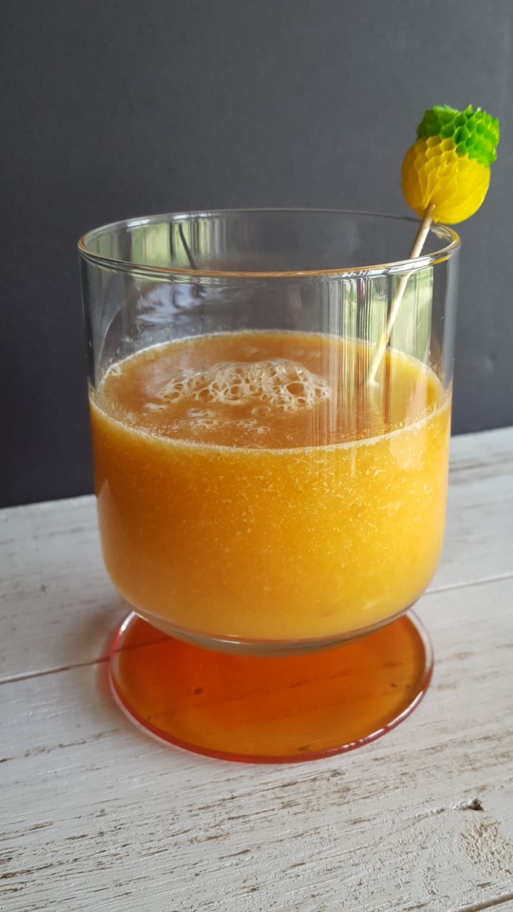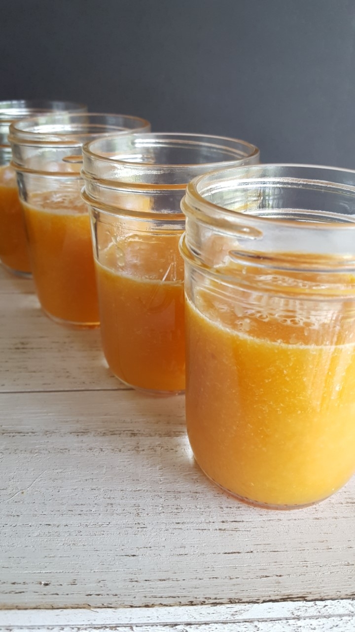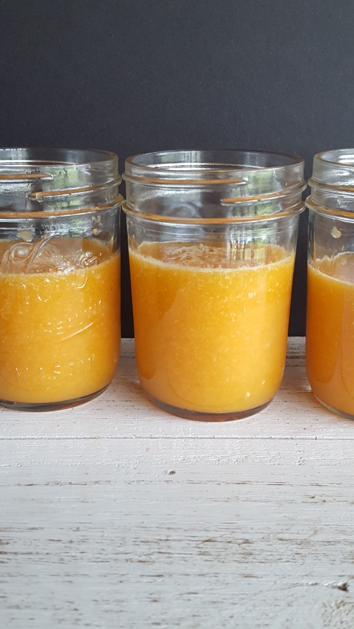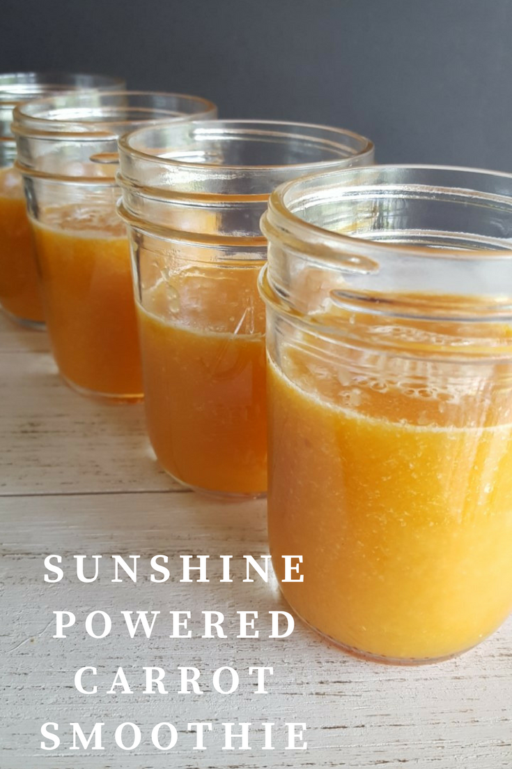 I used my immersion blender to make this smoothie. I grated the carrots first and then combined orange segments and juice and blended it all to make the smoothie. I portioned out the smoothie into half pint jars and froze them for the week. This is a perfect pick-me-up at lunch time.